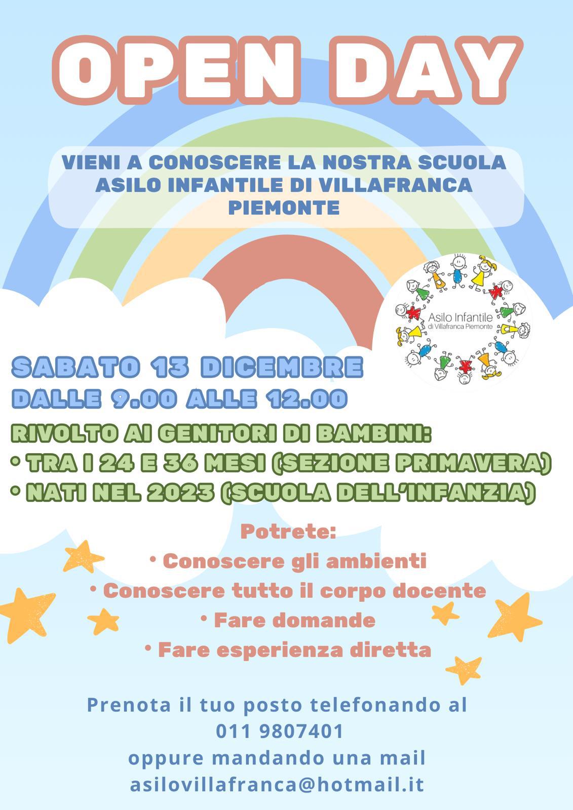 Descrizione L'Asilo Infantile di Villafranca Piemonte invita i genitori dei bambini tra i 24 e i 36 mesi e quelli nati nel 2023 a partecipare all'Open day per conoscere la scuola (sezione primavera e scuola dell'infanzia), che si terrà sabato 13 dicembre 2025 dalle ore 9 alle ore 12.