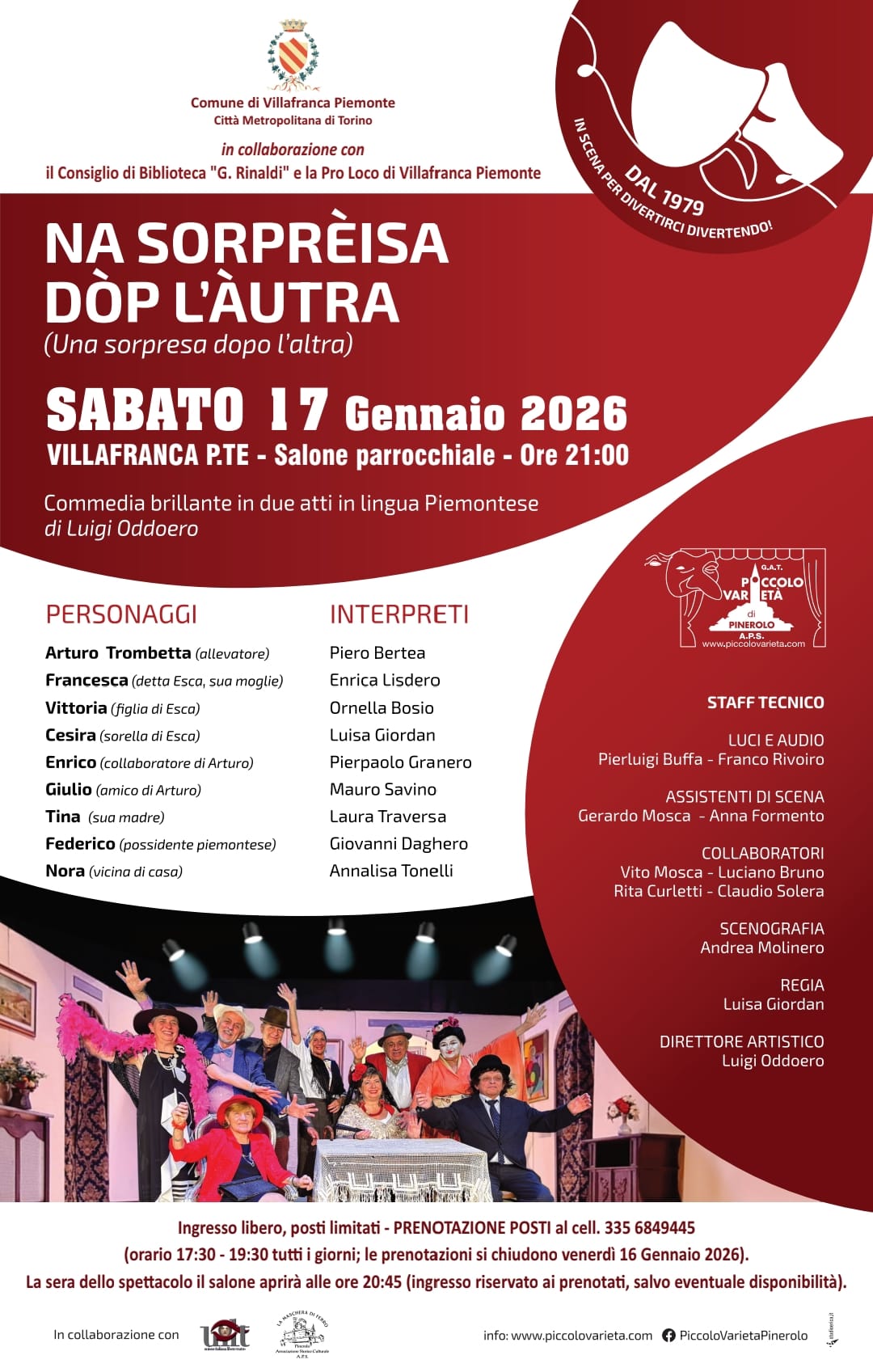 Nell'ambito della rassegna teatrale promossa dal Comune di Villafranca Piemonte, in collaborazione con il Consiglio della Biblioteca Comunale "G. Reinaldi" e la Pro Loco, sabato 17 gennaio 2026, alle ore 21, nel salone parrocchiale, il Piccolo Varietà aps di Pinerolo presenta la commedia "Na sorprèisa dòp l'àutra", commedia brillante in due atti in lingua Piemontese di Luigi Oddoero.
