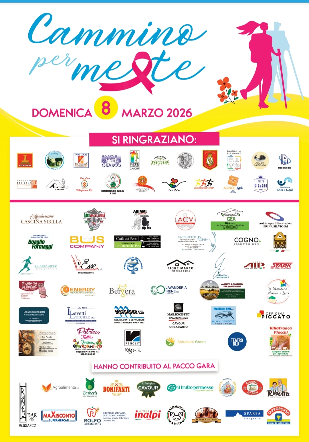 Domenica 8 marzo 2026, i Comuni di Cavour, Bagnolo Piemonte, Barge, Bibiana, Bricherasio, Buriasco, Campiglione Fenile, Cercenasco, Garzigliana, Macello, Osasco, Vigone e Villafranca Piemonte propongono la camminata solidale organizzata nel territorio del Pinerolese dal titolo "Cammino per me & te", in occasione della Giornata Internazionale della Donna.