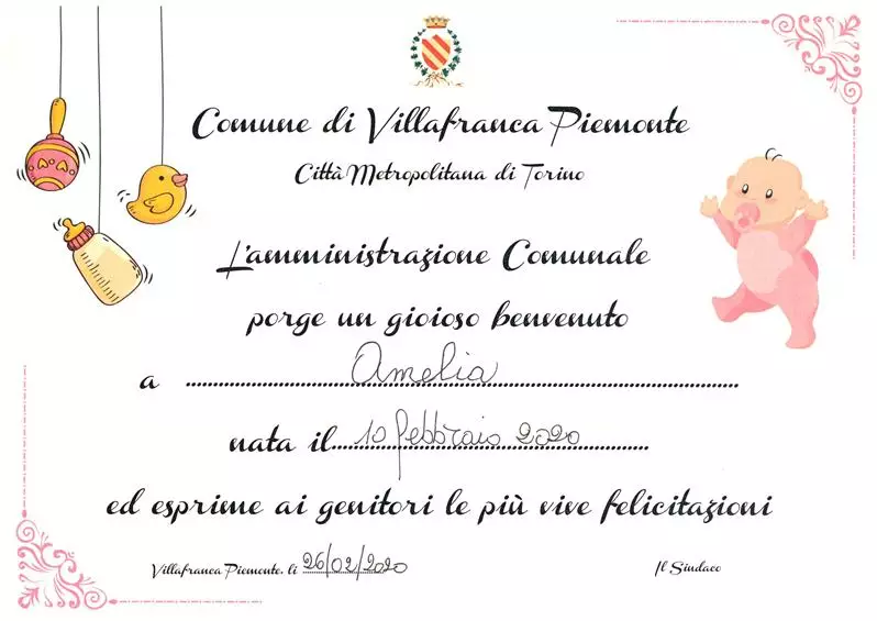 Descrizione L'Amministrazione Comunale porge un gioioso benvenuto ad Amelia nata il 10 febbraio 2020 ed esprime ai genitori le più vive felicitazioni.