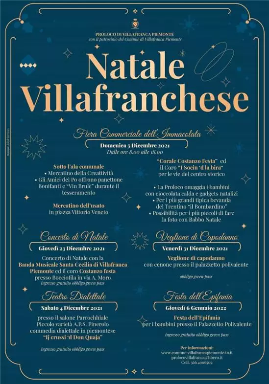Programma di eventi previsti per il Natale 2021. Organizzato dalla Proloco di Villafranca Piemonte con il patrocinio del Comune di Villafranca Piemonte.