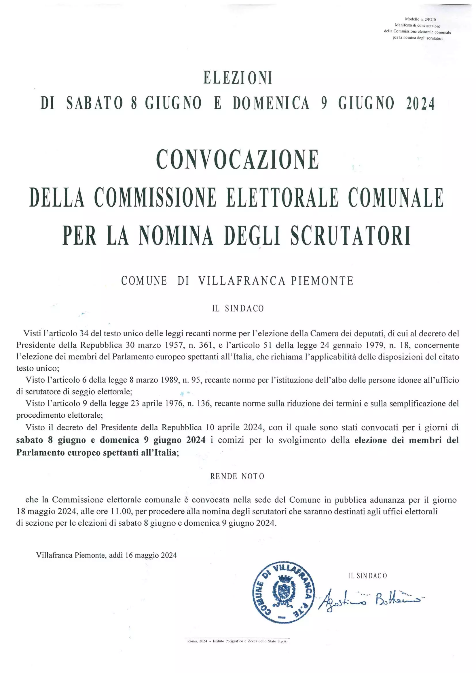 Si rende noto che la Commissione Elettorale Comunale è convocata nella sede del Comune in pubblica adunanza per il giorno sabato 18 maggio 2024, alle ore 11.00, per procedere alla nomina degli scrutatori che saranno destinati agli uffici elettorali di sezione per le elezioni di sabato 8 giugno e domenica 9 giugno 2024.